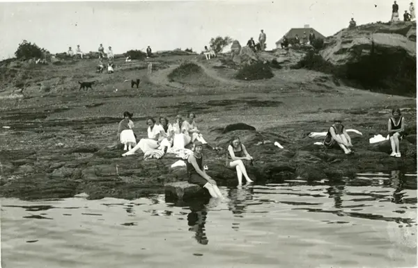 Paradisbukta. Badestrand på Bygdøys vestside. Utfartsted for bad og frilufstliv. Kvinner i strandkanten. Folk og hunder langs åssiden. I Bakgrunnen taket på Villa Gjøa. 1920 tallet.