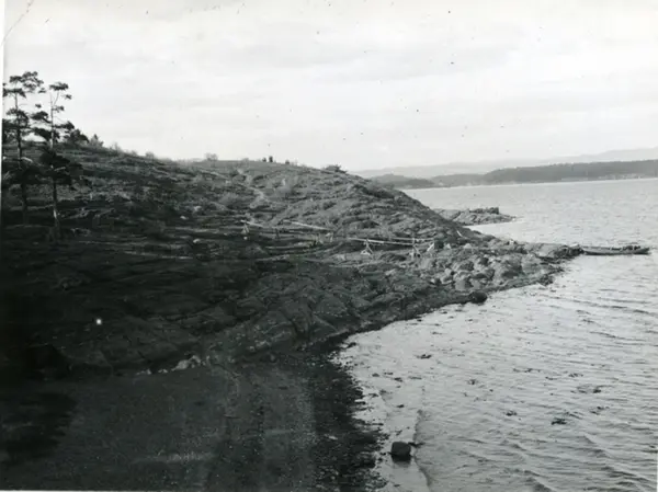 Rolfstangen badested. Opparbeidelse til badestrand. Rettesnorer for gangvei over bergknausen mellom søndre og nordre badestrand. Robåt. Søndre sandstrand sett nordover.