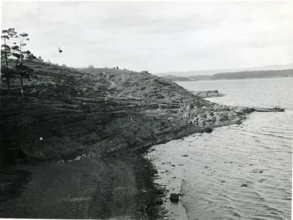 Rolfstangen badested. Søndre sandstrand sett nordover. Opparbeidelse av gangveier på knausen mellom søndre og nordre sandstrand. Trebåt. Bygdøylandet i bakgrunnen.
