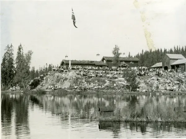 Tryvannstua bygd i 1931 av vindfallstømmer etter stormen i november 1930, og ble utvidet og ombygd i 1965. Turfolk sittende mellom stua og Store Tryvann. Flaggstang med flagg. Andehus på torvmatte som flyter på vannet i forgrunnen.