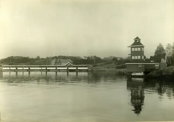 Hovedøya bad. Damebadet på Sørsiden av Vestre Hovedøy. Damebadets betalingsbad med stupetårn og skiftekabiner til høyre på bildet. Sandstranda med turvei og inngjerdet område for badeanlegget. Fribadet for damer med skifteskur til venstre. Bakenfor ses Lindøysund kruttmagasin.