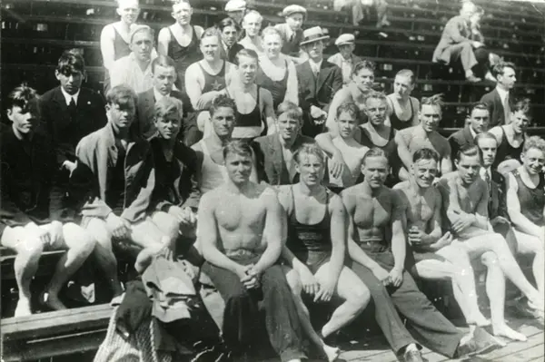 Filipstadkaia. Portrettbilde av en gruppe konkurransesvømmere sittende på tribunebenkene. Uvist om bildet er tatt på den gamle stadion (1925 - 32) eller den nye stadion (1933 - 41)