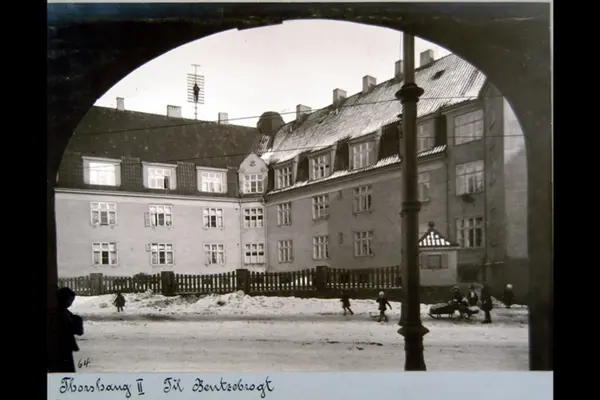 Husfasade sett gjennom buegang mot Bentsebrugata. Barn triller barnevogner. Fra kvartal II i Torshovkvartalene (Torshovbyen). Sannsynligvis fra 1920-tallet. Albumtittel: "Fotografier over Kristiania kommunes boligbebyggelse".