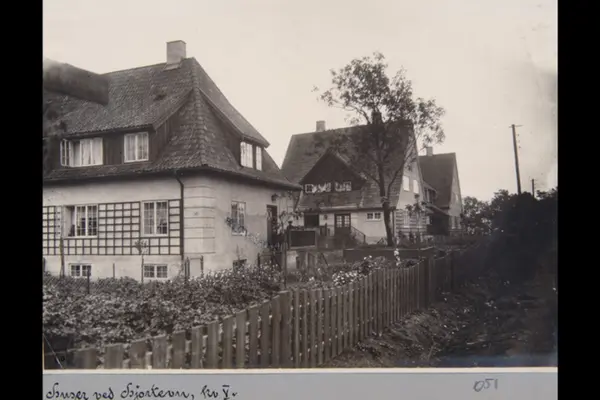 Fra kvartal V i Ullevål Hageby. Bebyggelse i Hjorteveien. Sannsynligvis fra 1920-tallet. Albumtittel: "Fotografier over Kristiania kommunes boligbebyggelse".