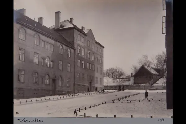 Husfasader i kvartal A mot Fjørtofts gate i Vøyenvollen-komplekset. Vøyenvollen (Vøienvolden) gård i bakgrunnen. Sannsynligvis fra 1920-tallet. Albumtittel: "Fotografier over Kristiania kommunes boligbebyggelse".