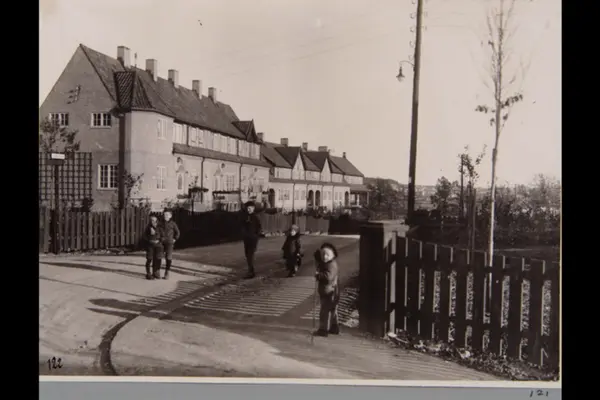 Langlia opp mot Nils Lauritssøns vei i Ullevål Hageby. Lekende barn. Sannsynligvis fra 1920-tallet. Albumtittel: "Fotografier over Kristiania kommunes boligbebyggelse".