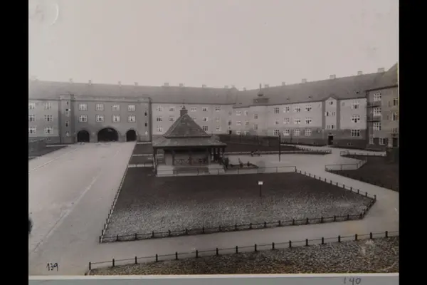 Mastrups gate gjennom bueganger. Husfasader mot indre gårdsplass. Inngjerdede plener. Barn i lek. Trafobygg. Fra kvartal VIII i Torshov-kvartalene (Torshovbyen). Sannsynligvis fra 1920-tallet. Albumtittel: "Fotografier over Kristiania kommunes boligbebyggelse".