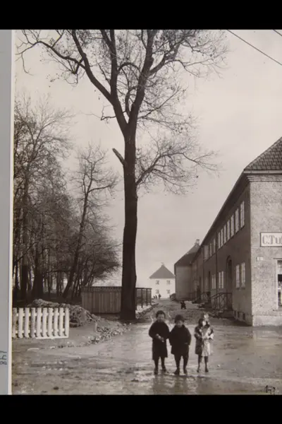 Bebyggelse i Tore Hunds vei (tidl. Fridtjovs vei), barna vender mot Økernveien. Skimter så vidt melkebutiken til Marmong. Barn vendt mot fotografen. Fra Lille Tøyen haveby (hageby). Sannsynligvis fra 1920-tallet. Albumtittel: "Fotografier over Kristiania kommunes boligbebyggelse".