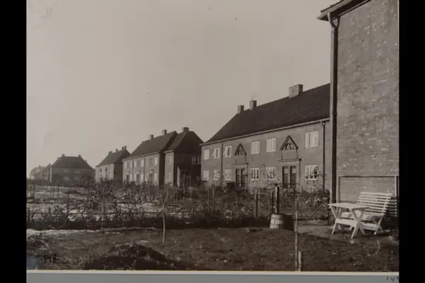 Bebyggelse på langs mellom Hovinveien og Ansgar Sørlies vei. Hager. Hagemøbler. Vannpost. Fra Lille Tøyen haveby (hageby). Sannsynligvis fra 1920-tallet. Albumtittel: "Fotografier over Kristiania kommunes boligbebyggelse".