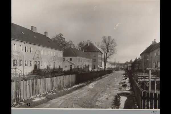 Bebyggelse langs Tore Hunds vei (tidl. Fridtjovs vei) på Lille Tøyen haveby (hageby). Sannsynligvis fra 1920-tallet. Albumtittel: "Fotografier over Kristiania kommunes boligbebyggelse".