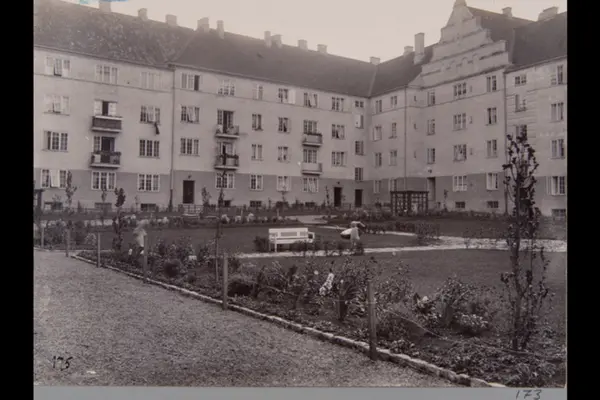 Husfasader mot indre gårdsrom i Jessenløkken Boligselskap i kvartalet Kirkeveien, Schwachs gate, Jacob Aalls gate og Suhms gate. Barn med barnevogn. Parkbenk. Sannsynligvis fra 1920-tallet. Albumtittel: "Fotografier over Kristiania kommunes boligbebyggelse".