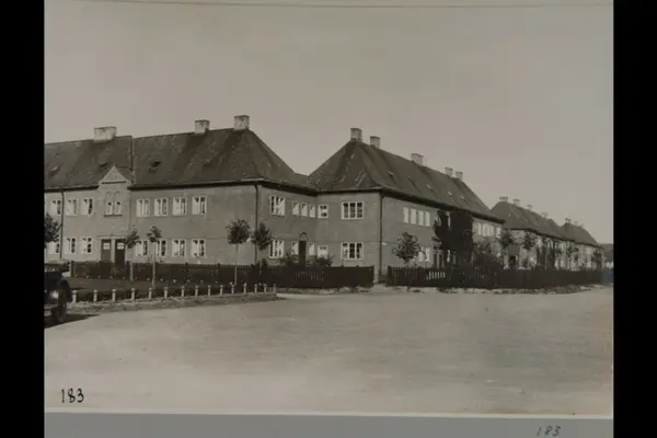 Husfasader mot Ansgar Sørlies vei. Kaare Røddes plass opp til venstre. Fra Lille Tøyen haveby (hageby). Sannsynligvis fra 1920-tallet. Albumtittel: "Fotografier over Kristiania kommunes boligbebyggelse".