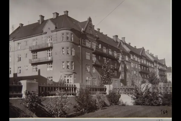 Husfasade mot Omsens gate (tidl. Kildals gate) og Hegermanns gate (forrest). Fra kvartal V i Torshovkvartalene (Torshovbyen). Sannsynligvis fra 1920-tallet. Albumtittel: "Fotografier over Kristiania kommunes boligbebyggelse".