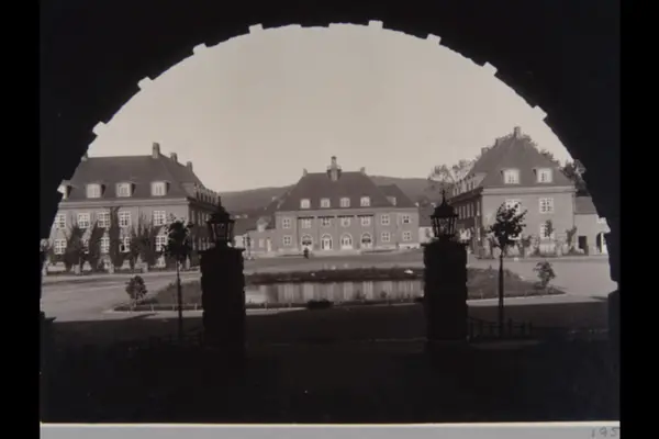 Damplassen med dammen på Ullevål Hageby sett nordover gjennom en portal / buegang. Sannsynligvis fra 1920-tallet. Albumtittel: "Fotografier over Kristiania kommunes boligbebyggelse".