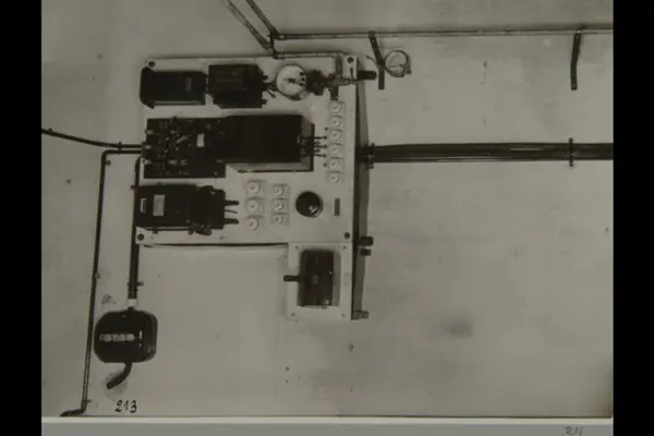 El-anlegg. Avlesnings- og sikringssboks i bolig, sannsynlig på Ullevål Hageby. Sannsynligvis fra 1920-tallet. Albumtittel: "Fotografier over Kristiania kommunes boligbebyggelse".