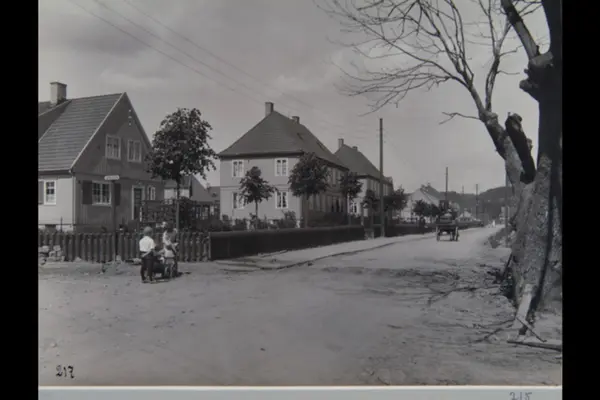 Boliger i krysset Jutulveien / Tåsenveien. Barn med lekevogn. Hest og kjerre på veien. Tåsenløkkenprosjektet. Sannsynligvis fra 1920-tallet. Albumtittel: "Fotografier over Kristiania kommunes boligbebyggelse".
