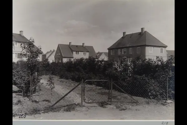 Bebyggelse i Spångbergveien og Tåsenveien. Hageoppgang. Hager med bærbusker. Tåsenløkkenprosjektet. Sannsynligvis fra 1920-tallet. Albumtittel: "Fotografier over Kristiania kommunes boligbebyggelse".