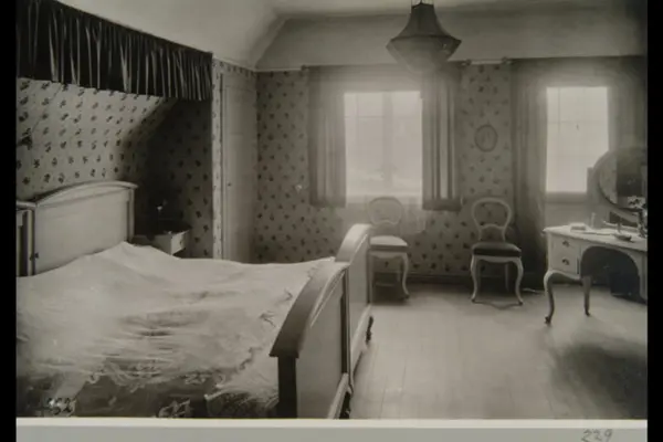 Soverom med dobbeltseng og møbler i rokokko-stil. Sannsynlig i bolig på Ullevål Hageby. Sannsynligvis fra 1920-tallet. Albumtittel: "Fotografier over Kristiania kommunes boligbebyggelse".