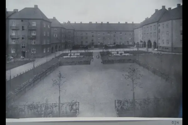 Husfasader mot indre gårdsplass i kvartal VII i Torshovkvartalene (Torshovbyen). Grusganger og parkbenker. Mastrups gate gjennom portaler og bueganger i bakgrunnen. Sannsynligvis fra 1920-tallet. Albumtittel: "Fotografier over Kristiania kommunes boligbebyggelse II".