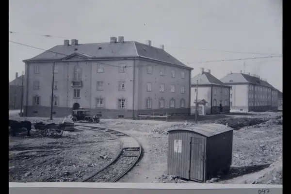 Bergensgata 12B. Trikkesløyfe på Lisa Kristoffersens plass. I venstre bildekant ser vi Bergensgata. Til høyre anlegges Stavangergata. Bil og hest med kjerre.Sannsynligvis fra 1920-tallet. Albumtittel: "Fotografier over Kristiania kommunes boligbebyggelse II".