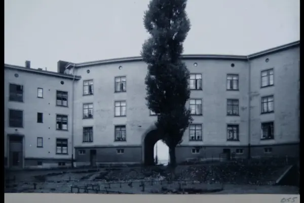 Husfasader og portal / buegang mot indre gårdsplass i kvartal I ved Hans Nielsen Hauges plass. Gårds-tre. Fra Søndre Åsen-kvartalene. Sannsynligvis fra 1920-tallet. Albumtittel: "Fotografier over Kristiania kommunes boligbebyggelse II".