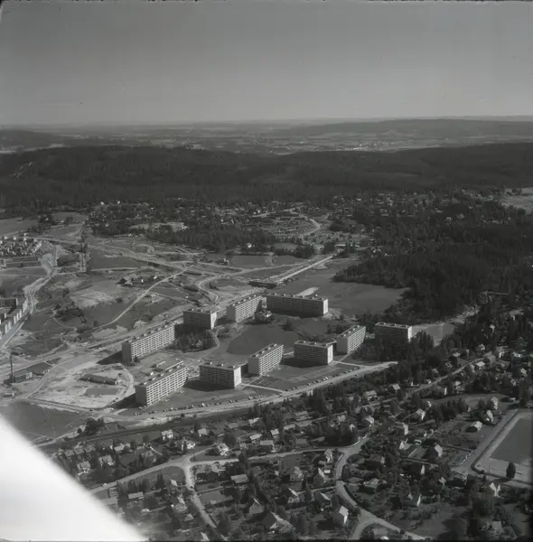 Hovedbanen, Ole Brums vei, Østre Aker vei, Linjeveien, Høybråten idrettsplass, Kringveien, Nybyggerveien, Garver Ytteborgs vei, Groruddalen, Stig, Fossumveien, Gjelleråsen (Flyfoto)