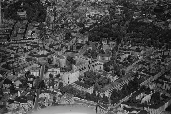 Det gamle Rikshospitalet i Pilestredet 32, Waldemar Thranes gate, Holbergs plass, Holbergs gate, Stensberggata, Nordahl Bruns gate, Frimanns gate. St. Hanshaugen og Vår Frelsers gravlund i bakgrunnen. (Flyfoto).