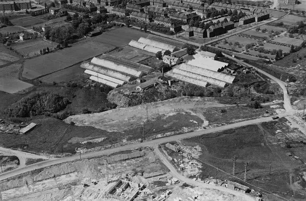 Grenseveien, Hovinveien, St. Jørgens vei. Gartneriene til Per Lindbek. Nedenfor ligger en søppelfylling, og mellom den og garneriet gikk Hovinbekken. Grenseveien diagonalt gjennom bildet. Lillebergveien foran til høyre. Blokkbebyggelse på Lilleberg i St. Jørgens vei (daværende Hovinveien) under oppføring. Lille Tøyen haveby (hageby) i bakgrunnen. (Flyfoto). Bildets originale tittel (Lille Töyen) er misvisende.