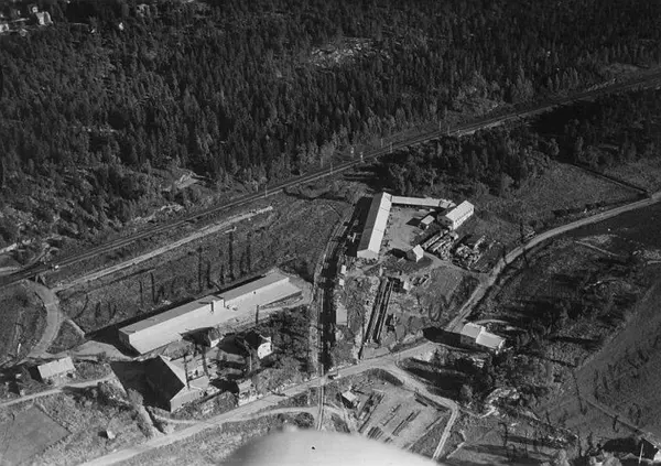 Holm gård nede til venstre, foran plastikkfabrikken til Per Thorkildsen. Helt nede i høyre hjørne skimtes også litt av tunet på Nordre Ås gård. Den lange veien i forgrunnen er Rosenholmveien. Den starter nede i venstre hjørne og går ut i midten av høyre billedkant. Veistubben som svinger i en bue i venstre billedkant (til venstre for plastikkfabrikken) er litt av den gamle Holmliveien. I bakgrunnen Østfoldbanen. Midt på bildet, i retning mot Østfoldbanen, sees traséen til den gamle jernbanelinjen. Her gikk toget mellom 1879 og 1925. Til høyre for den gamle jernbanetraséen ligger A/S Betonmast (mellom Rosenholmveien og Østfoldbanen) og verktøyfabrikken til Brødrene Larsen (ved Rosenholmveien). Påskrift på bildet: Per Thorkildsen Plastic A/S Betonmast Brødrene Larsen & co. (Flyfoto)