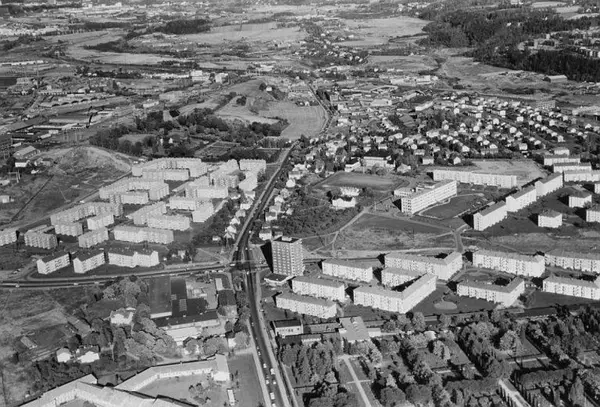 Strømsveien, Store Ringvei (Hjalmar Brantings vei, Adolf Hedins vei), Karl Staaffs vei, Agmund Bolts vei, Regnbueveien. Solvang. Gullhaug. Ulven gård. Hovin skole. Teisen gymnas (videregående skole). Timms Reperbane. Østre gravlund. Østre Aker kirkegård. Østre Aker kirke. (Flyfoto)