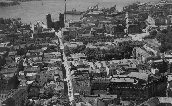 Universitetsgata (dels nåværende Roald Amundsens gate), Frederiks gate, Ruseløkkveien, Munkedamsveien. Rådhuset. Tullinløkka, Kulturhistorisk Museum, Nasjonalgalleriet, Nationaltheatret. Odd Fellow-bygningen. Akers mek. Verksted i bakgrunnen. (Flyfoto)