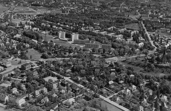 Kirkeveien, Sognsveien, Prestegårdsveien, Hasselhaugveien, Duehaugveien, Nedre Ullevål, Ullevålsalleen. John Colletts plass. Ullevål kino. Ullevål studentby. Sykepleierhøgskolen. Waisenhuset (Vestre Aker skole). Vestre Aker kirke. Nordre gravlund i bakgrunnen. (Flyfoto)