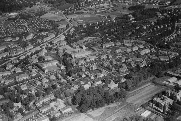 Sognsveien, John Colletts alle, Pastor Fangens vei, Ullevålsalleen, Nils Lauritssøns vei, Langlia, Bergsalleen, Askeladdveien. Damplassen. Ullevål skole. Waisenhuset (Vestre Aker skole). Nordvestre del av Ullevål sykehus sitt område. Sogn Hagekoloni, Ullevål Stadion, tyskerbrakker, Store Berg gård og Tåsenhjemmet i bakgrunnen. (Flyfoto)