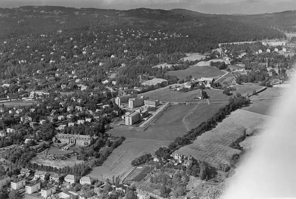 Store Ringvei (Torgny Segerstedts vei), Rasmus Winderens vei (tidl. en del av Blindernveien), Slemdalsveien, Sognsvannsveien, Aasmund Vinjes vei, Ivar Åsens vei. Diakonhjemmets sykehus (psykiatrisk avd. og poliklinikk, Vinderen). Sentralinstituttet for Industriell Forskning (senere Senter for industriforskning - SI -, nå SINTEF) Nåværende PFI-bygget (Papirindustriens forskningsinstitutt). Vestre Gaustad gård. Gaustad sykehus. Ris, Slemdal og Vettakollen i bakgrunnen. (Flyfoto)