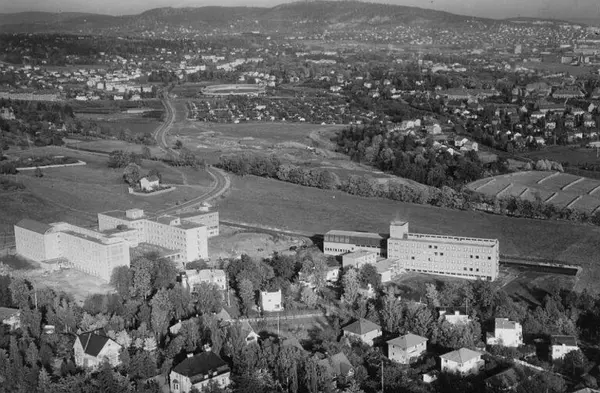 Store Ringvei (Torgny Segerstedts vei), Forskningsveien, Børrestuveien, Aasmund Vinjes vei. Sentralinstituttet for Industriell Forskning (senere Senter for industriforskning - SI, nå SINTEF). Nåværende PFI-bygget (Papirindustriens forskningsinstitutt). Sogn Hagekoloni, Ullevål Stadion og Ullevål Hageby nærmest i bakgrunnen. Grefsenkollen bakerst. (Flyfoto)