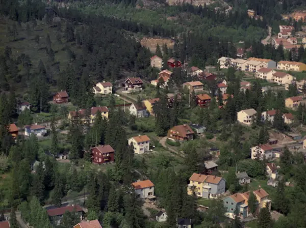 Kildeveien, Stølsveien, Årvollveien Det gule og blå huset nede til høyre er Kildeveien 25. Øverst til høyre er slutten på Årvollveien, der Oslo Østres skytebane lå, og der de nye blokkene i Årvollskogen er kommet. (Flyfoto)
