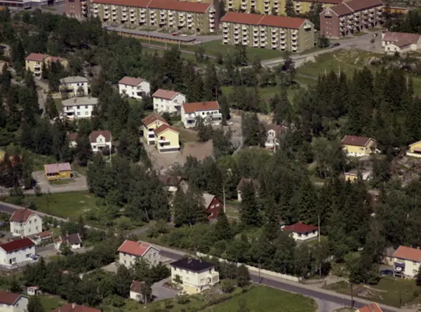 Skiferveien og Hellinga (blokker) bakerst. Lambertseter kirke bak til høyre. Bro over t-banen til Hellinga. Oberst Rodes vei og Kaptein Oppegaards vei i forgrunnen. (Flyfoto)