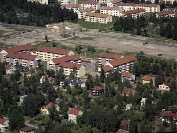 Lambertseterbanen skimtes til venstre. Cecilie Thoresens vei bak. Østerliveien (blokker) i bakgrunnen. Radarveien (blokker) foran Cec. Thoresens vei. Lambertseter senter, bensinstasjonen og industribygg ligger i dag på den ubebygde plassen. (Flyfoto)