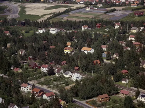 Steingrims vei i front, foran Lambertseterbanen (mellom Karlsrud og Brattlikollen). Villabebyggelse i Kåres vei, Steinliveien og Østerliveien. Sandstuveien i øvre venstre hjørne. Lyst område i øvre kant ligger langs Høgdaveien ved nåværende Trygve Ryens vei, Svenskerud (gartneri). (Flyfoto)