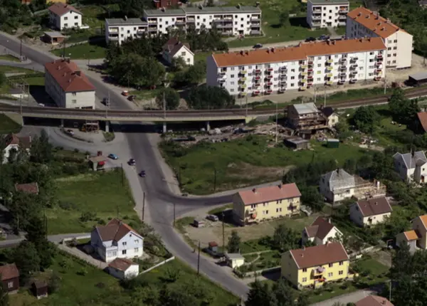 Sandstuveien under Lambertseterbanen (t-bane). Hus med stillas ble flyttet til side da linjen ble anlagt. Villabebyggelse i Steingrims vei. Blokker i Frøydis vei.(Flyfoto)