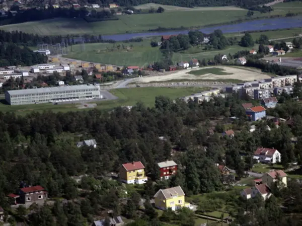 Villabebyggelse i Vardeveien. Blokker til høyre er Brattlikollen. Philips(stort bygg), Sandstuveien 70. Bak Phillips ses rekkehusene og firemannsboligene i Treskeveien og Skigardveien, Østensjøvannet og Østensjø gård. I bakgrunnen går Høgdaveien ved Svenskerud. Nordre Abildsø Hovedgård med omformerstasjonen i Plogveien til venstre. (Flyfoto)