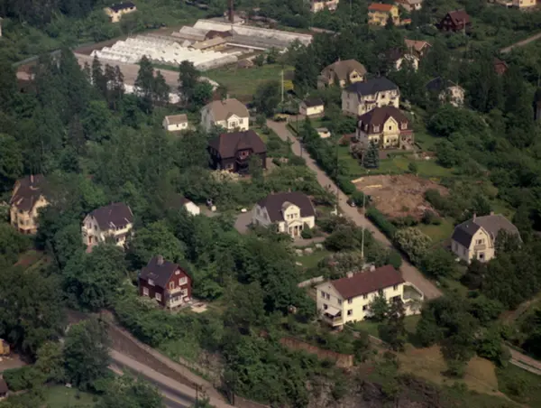 Villabebyggelse på Lilleaker. Lilleakerveien nederst til venstre. På skrå midt på bildet er Kirkehaugsveien som går forbi Olsens gartneri og ender ved Bestumveien øverst til venstre. (Flyfoto)