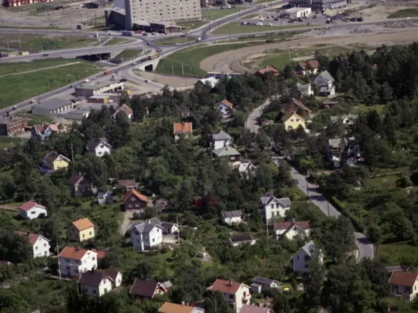 Villabebyggelse i Lyngveien. Enebakkveien fra venstre inn mot rundkjøringen og krysser Vårveien før den går over Lambertseterbanen. Ryen Trygdebolig ruver øverst i bildet. Mot høyre går E6 "Europaveien". Halvt mot høyre forsetter Enebakkveien. Til venstre går Svartdalsveien mens Store Ringvei starter opp halvt venstre.Ryenkrysset i bakgrunnen. (Flyfoto)