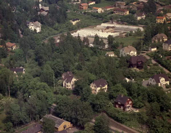 Lilleakerveien nederst i bildet. Kirkehaugsveien til høyre. Bestumveien fra Lilleakerveien, forbi Olsens gartneri, til Sollerudveien øverst i bildet. (Flyfoto)