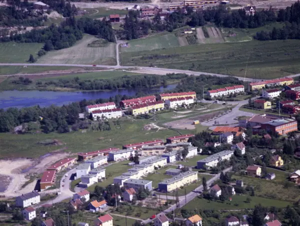 Enebakkveien, Agronomveien og Abildsø skole. Nærmest Østensjøvannet ligger rekkehusene i Svaneveien og Grågåsveien. Østensjøveien i bakgrunnen. Eterfabrikken og Bøler kirke bakerst i bildet. (Flyfoto)
