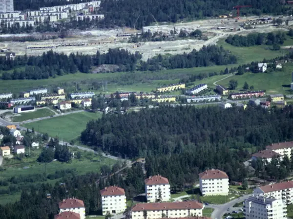 Boligblokker i Østerlisvingen og Gina Krogs vei i front. Rekkehus på Abildsø/Langerud bak. Lambertseterveien og Enebakkveien møtes i Abildsøkrysset til venstre. I bakgrunnen er utbyggingen av Bogerud i gang. Boligblokker på Bøler bak til venstre. Over blokkene i front sees ovarennet til Bekkelagsbakkene, revet i 1974. (Flyfoto)