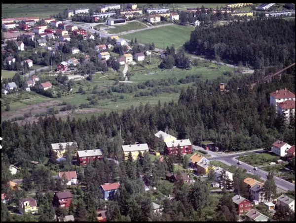 Raschs vei krysser Østerliveien i forgrunnen. Lambertseterveien/Østensjøveien og Enebakkveien møtes i Abildsøkrysset lenger bak. Abildsøveien til venstre.(Fyfoto)
