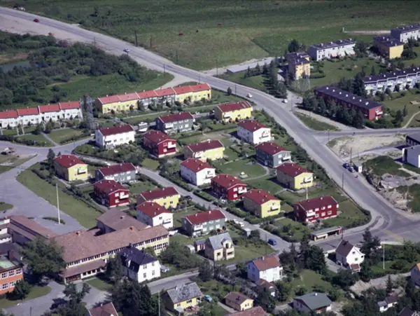 Enebakkveien og Østensjøveien i Abildsøkrysset, foran til høyre. Svaneveien og Abildsø skole til venstre. Rekkehusene i Langerudsvingen bak til høyre. (Flyfoto)