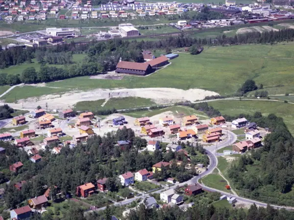 Skøyenbrynet, Stordamveien og Stordamsnaret.Tveten gård bak. På jordene til høyre ligger i dag skolene Tveita og Hellerud. Jernbanesporet til hovedbanen sees i bakgrunnen, sammen med bebyggelsen på Teisen. (Flyfoto)