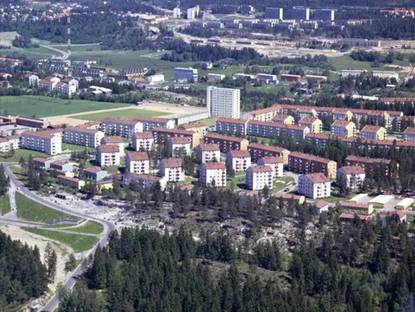 Mikrobølgen og Langbølgen til venstre. Boligblokker i Mellombølgen, Gråsteinveien og Bergkrystallen nærmest. Bebyggelsen på Langerud i bakgrunnen. Boligblokker på Bøler i bakgrunnen. (Flyfoto)